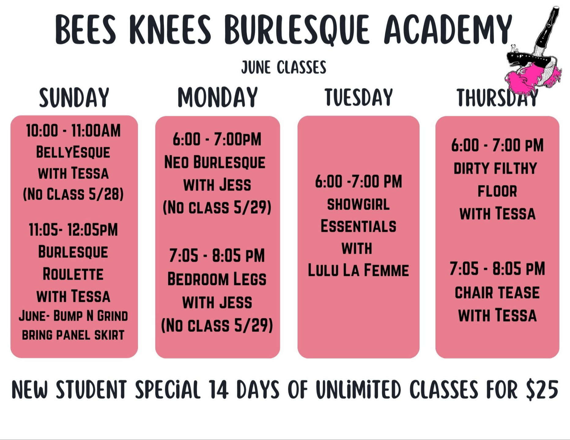 At Bees Knees Burlesque and Pole Academy, we believe that everyone can dance! Our studio offers a fun and supportive environment for dancers of all levels. If you're ready to get sexy and weird, we're the studio for you!